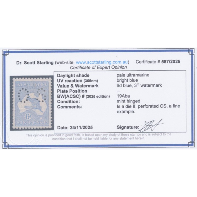 AUSTRALIA 1915 6d pale ultramarine Kangaroo, die II, 3rd watermark, perforated OS, mint hinged – no thins, tears or bends. Has a Starling certificate. BW(ACSC) Cat. # 19Aba SG Cat. # O46