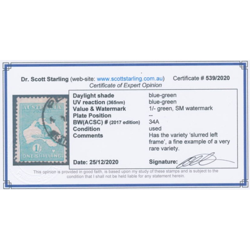 1929 1/- blue-green Kangaroo, small multiple watermark, with the variety ‘slurred left frame’, used – no thins, tears or bends. Has a Starling certificate.