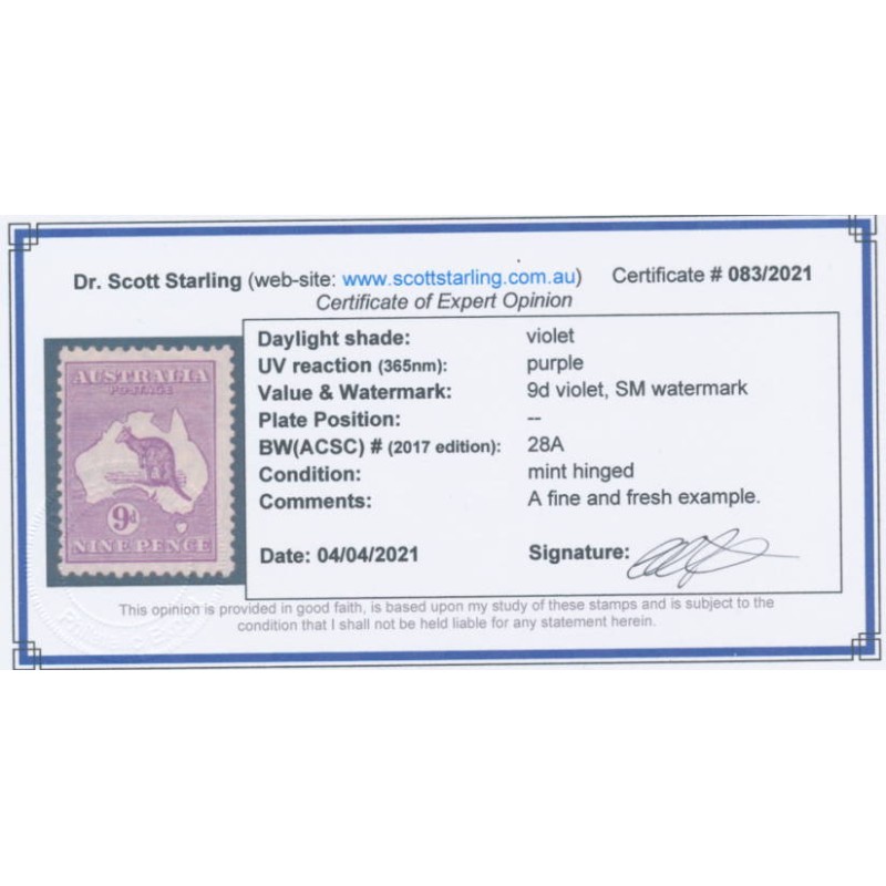 AUSTRALIA 1929 9d violet Kangaroo, small multiple watermark, mint hinged – no thins, tears or bends. Has a Starling certificate. BW(ACSC) Cat. # 28A SG Cat. # 108