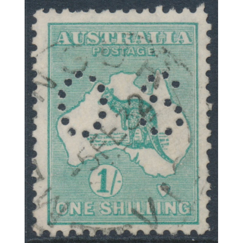AUSTRALIA 1929 1/- blue-green Kangaroo, small multiple watermark, perforated OS, used – no thins, tears or bends. BW(ACSC) Cat. # 34Ab SG Cat. # O116