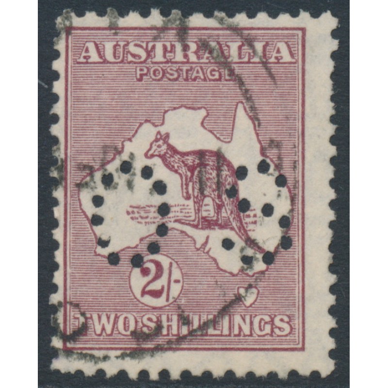 1929 2/- maroon Kangaroo, small multiple watermark, perforated OS, used – no thins, tears or bends.