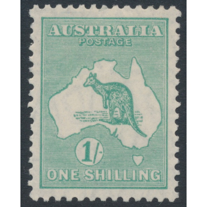 AUSTRALIA 1929 1/- emerald Kangaroo, small multiple watermark, mint hinged – no thins, tears or bends. BW(ACSC) Cat. # 34C SG Cat. # 109