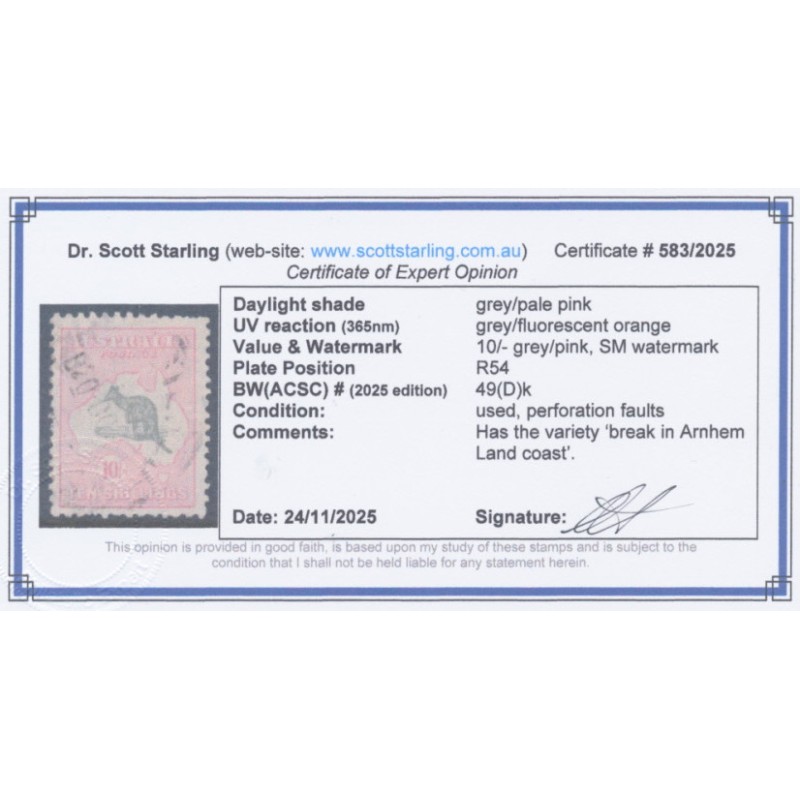 1929 10/- grey/pale pink Kangaroo, small multiple watermark, with the variety ‘break in Arnhem Land coast’ [plate position = R54], used – has some short perforations. Has a Starling certificate.