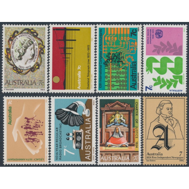 AUSTRALIA 1972-1974 the eight different 7c commemoratives, mint never hinged – no thins, tears or bends. SG Cat. # 509, 517, 522, 536, 553, 560, 568, 578