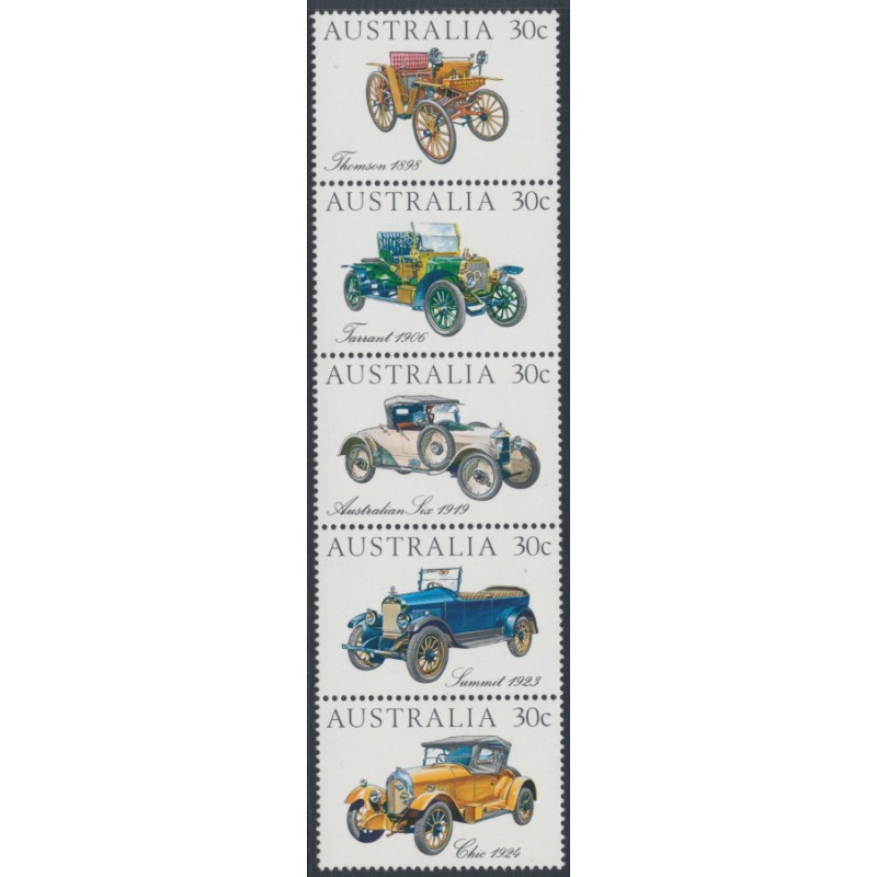 AUSTRALIA 1984 30c Veteran & Vintage Cars se-tenant strip of 5, mint never hinged – no thins, tears or bends. SG Cat. # 905a