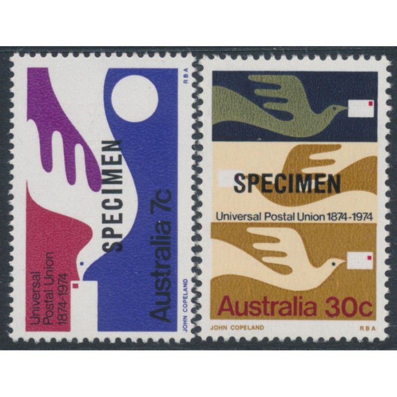 AUSTRALIA - 1974 UPU set of 2 with SPECIMEN o/p for Philas House, MNH – SG # 576s-577s