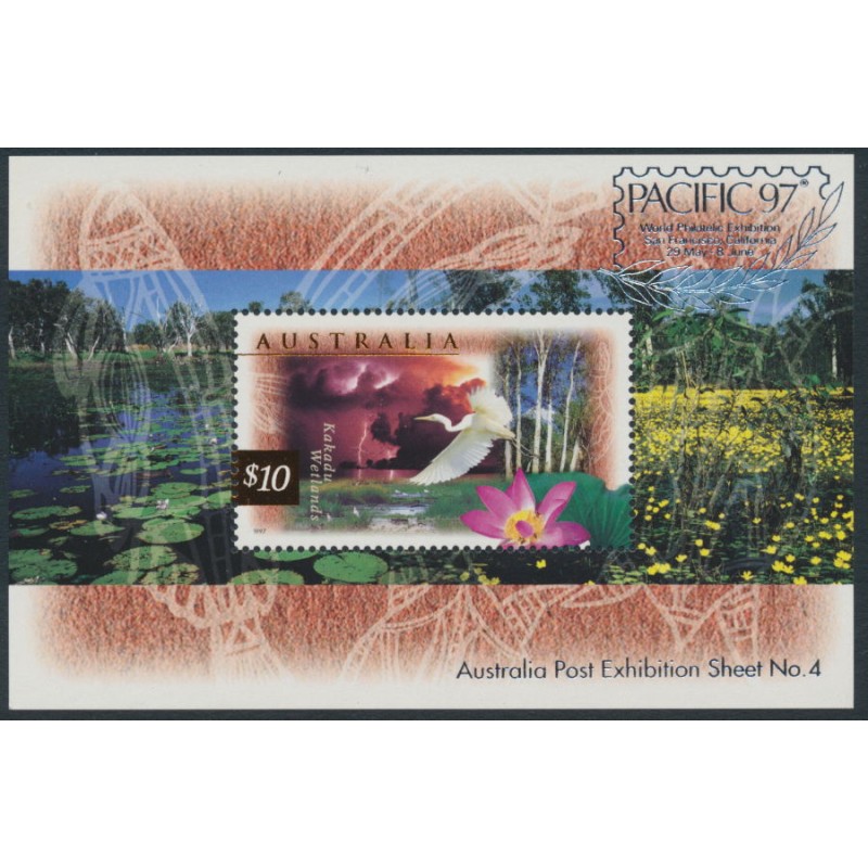 AUSTRALIA 1997 $10 Kakadu Wetlands M/S overprinted Pacific ‘97, mint never hinged – no thins, tears or bends. SG Cat. # MS1686a