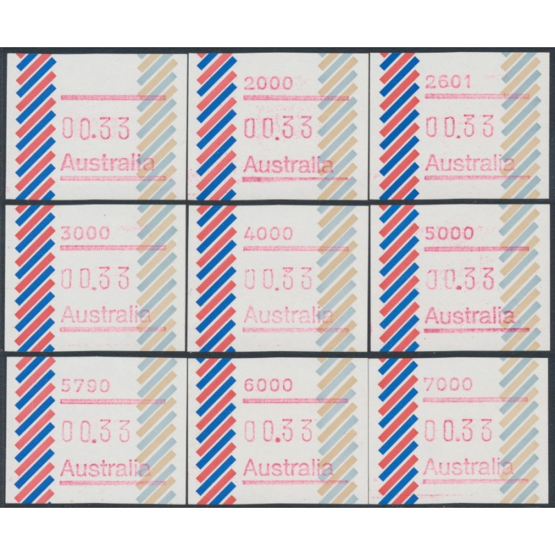 AUSTRALIA 1985 33c Barred Edge Framas set of eight postcodes plus no postcode, mint never hinged – no thins, tears or bends. ACSC(BW) Cat. # 1023Ab-1023Ib
