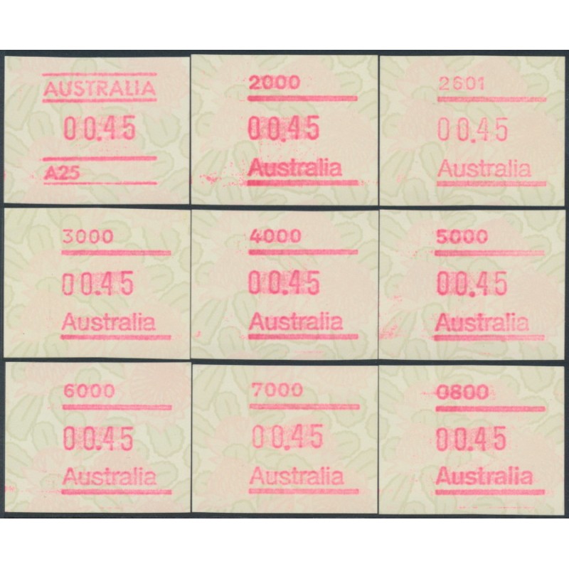 AUSTRALIA 1994 45c Waratah Framas set of eight postcodes plus A25, mint never hinged – no thins, tears or bends. ACSC(BW) Cat. # 1767A-1767I