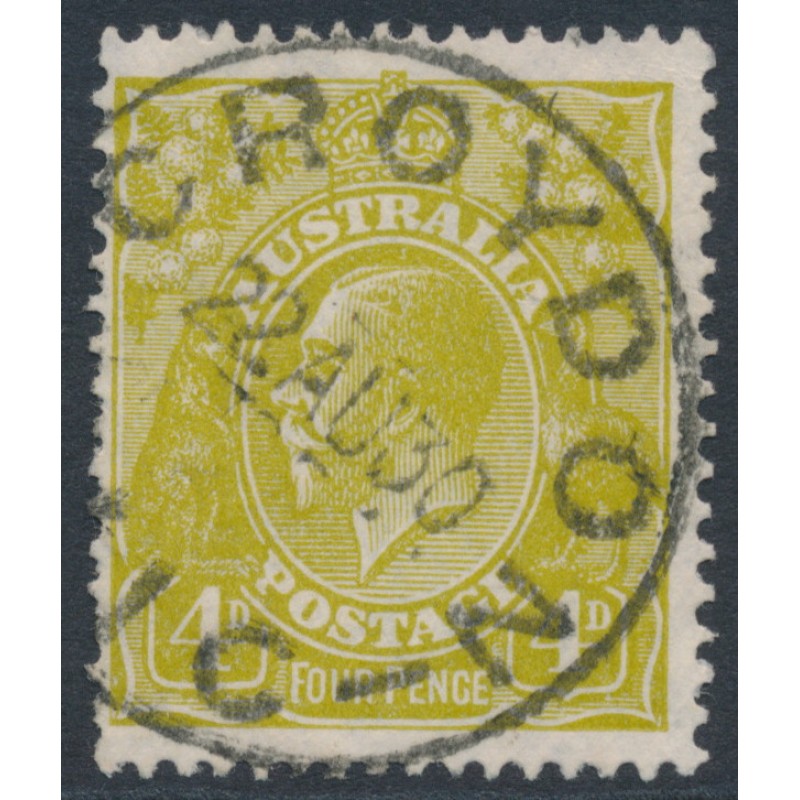1929 4d olive KGV Head, small multiple watermark, perf. 13½:12½, used – has a CROYDON, Victoria 22 AU 1930 cancel, no thins, tears or bends.