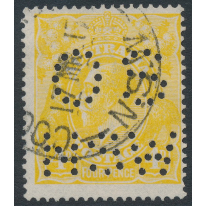 AUSTRALIA 1916 4d lemon-yellow KGV Head, single watermark, perforated OS NSW, used – no thins, tears or bends. Has a Starling certificate. BW(ACSC) Cat. # 110Cb SG Cat. # O41c