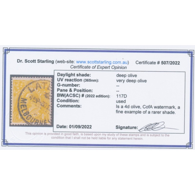 AUSTRALIA 1933 4d deep olive KGV Head, CofA watermark, used – no thins, tears or bends. Has a Starling certificate. BW(ACSC) Cat. # 117D