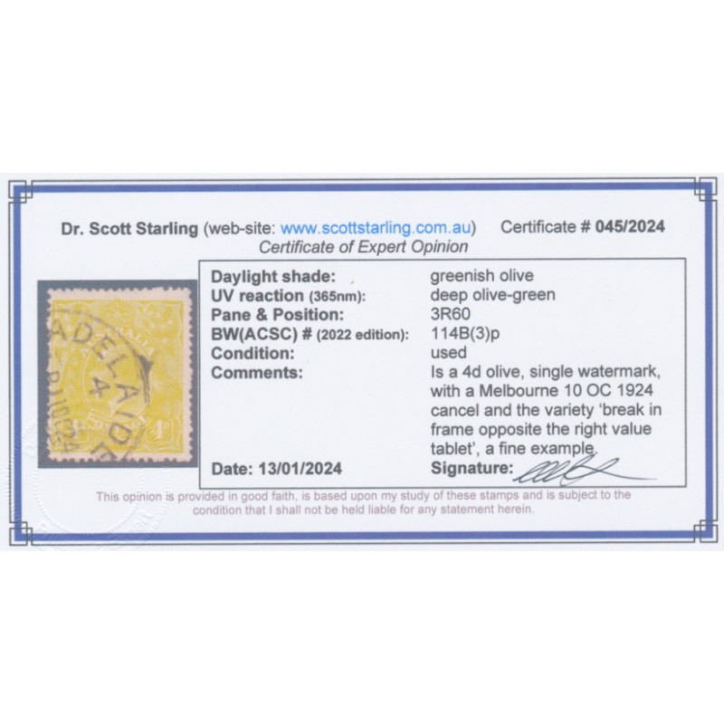 1924 4d greenish olive KGV Head, single watermark, with the variety ‘break in frame opposite right value tablet’ [position = 3R60], used – no thins, tears or bends. Has a Starling certificate.