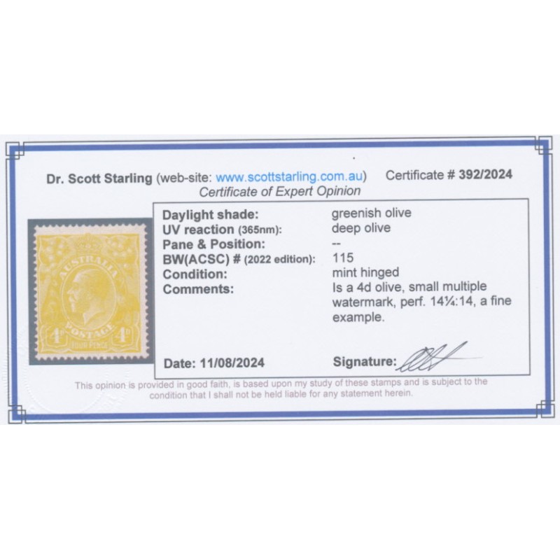 1927 4d greenish olive KGV Head, small multiple watermark, perf. 14¼:14, mint hinged – no thins, tears or bends. Has a Starling certificate.