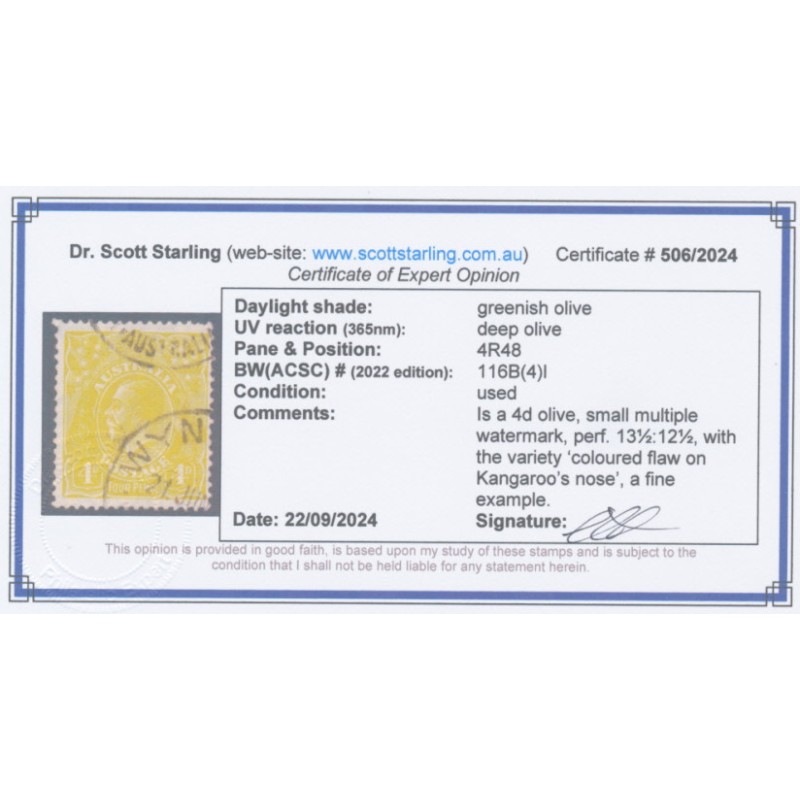 1929 4d greenish olive KGV Head, small multiple watermark, perf. 13½:12½, with the variety ‘coloured flaw on the Kangaroo’s nose’ [plate position = 4R48], used – no thins, tears or bends. Has a Starling certificate.