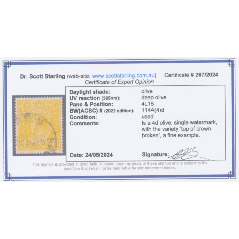 ![AUSTRALIA - 1924 4d olive KGV, 'broken crown top' [4L18], used – ACSC # 114A(4)d AUSTRALIA - 1924 4d olive KGV, 'broken crown top' [4L18], used – ACSC # 114A(4)d](https://www.scottstarling.com.au/image/cache/catalog/KGVGeneral/23467-250x250.jpg)