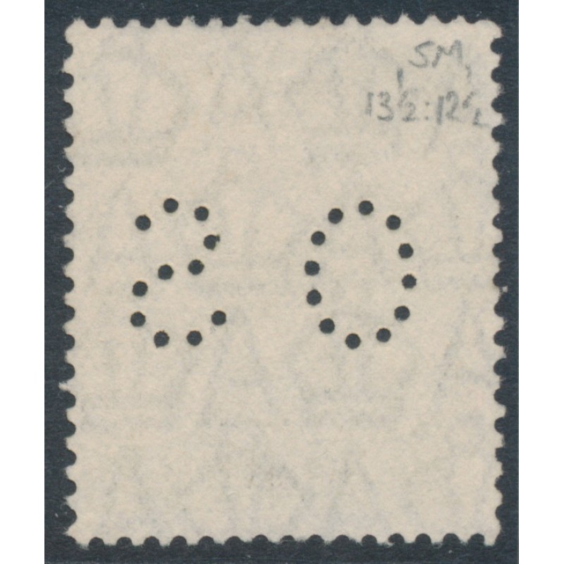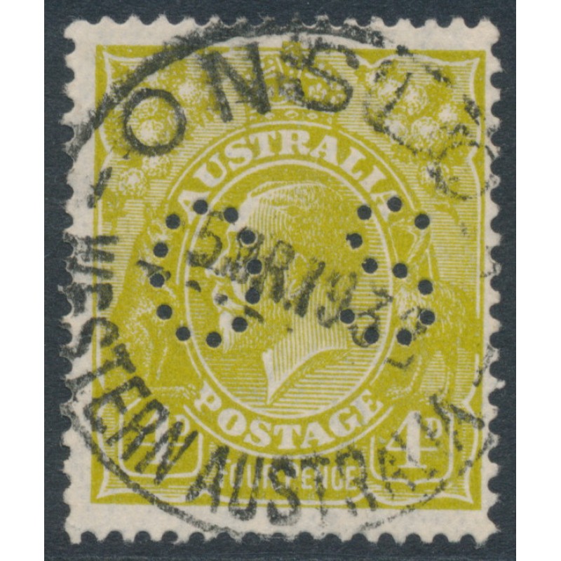 1929 4d greenish olive KGV Head, small multiple watermark, perf. 13½:12½, perforated OS, used – has an Onslow, Western Australia 5 MR 1933 cancel, no thins, tears or bends.