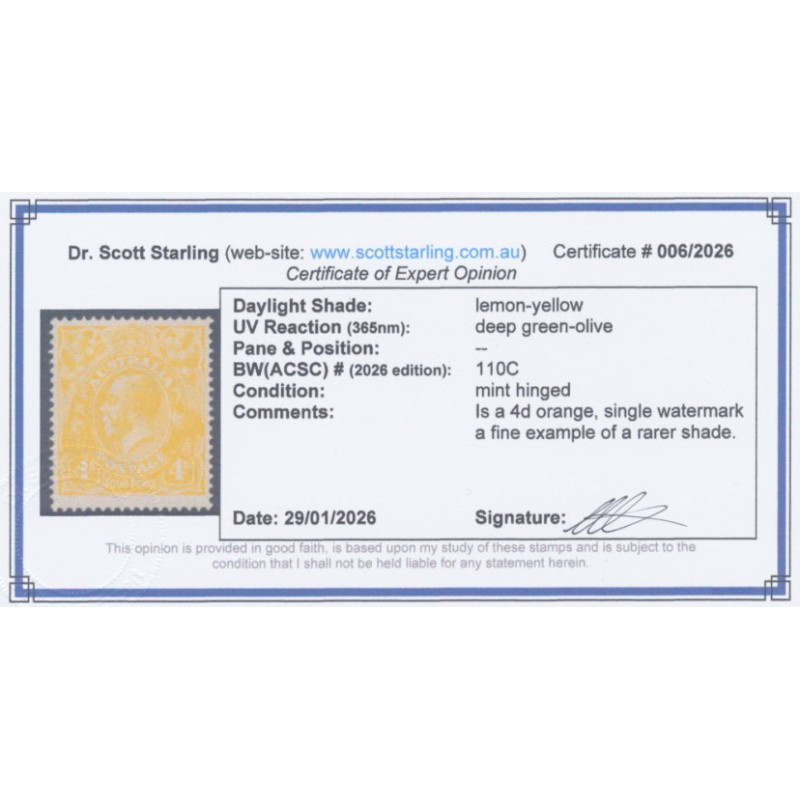 AUSTRALIA 1916 4d lemon-yellow KGV Head, single watermark, mint hinged – no thins, tears or bends. Has a Starling certificate. BW(ACSC) Cat. # 110C SG Cat. # 22b