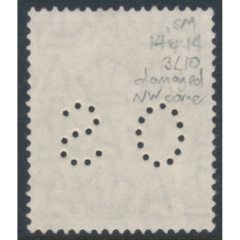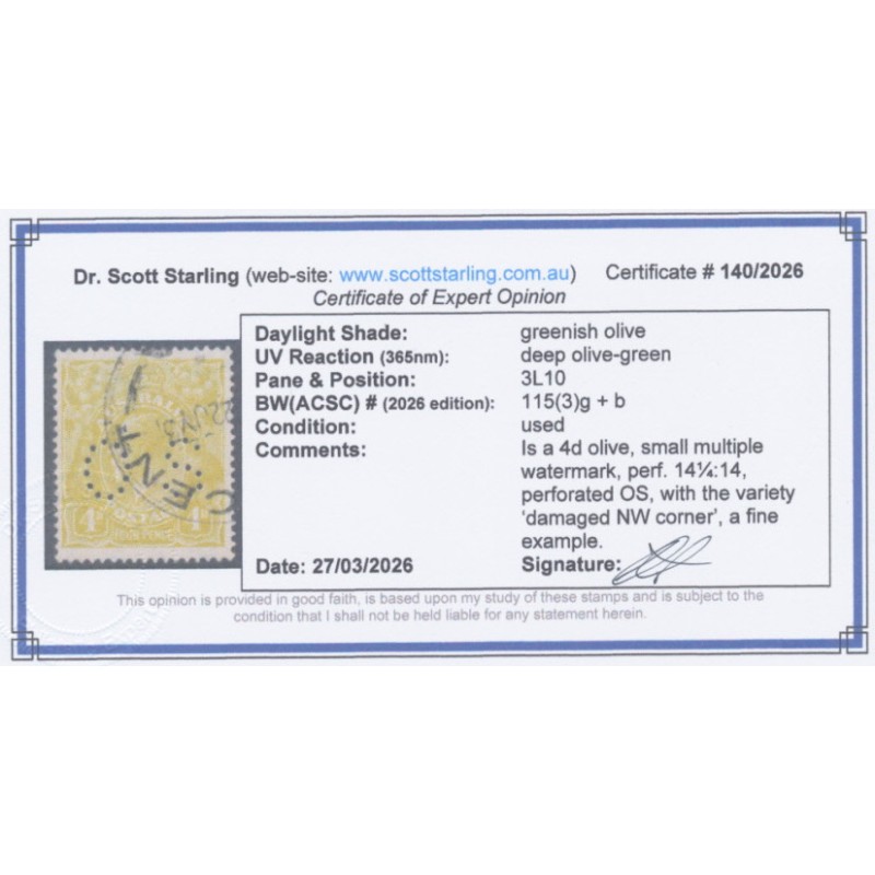 1928 4d greenish olive KGV Head, small multiple watermark, perf. 14¼:14, with the variety ‘damaged NW corner’ [plate position = 3L10], perforated OS, used – no thins, tears or bends. Has a Starling certificate.