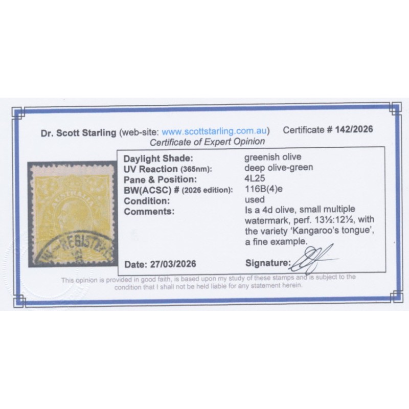 ![AUSTRALIA - 1929 4d olive KGV, 'Kangaroo's tongue' [4L25], used – ACSC # 116B(4)e AUSTRALIA - 1929 4d olive KGV, 'Kangaroo's tongue' [4L25], used – ACSC # 116B(4)e](https://www.scottstarling.com.au/image/cache/catalog/KGVGeneral/26717b-74x74.jpg)