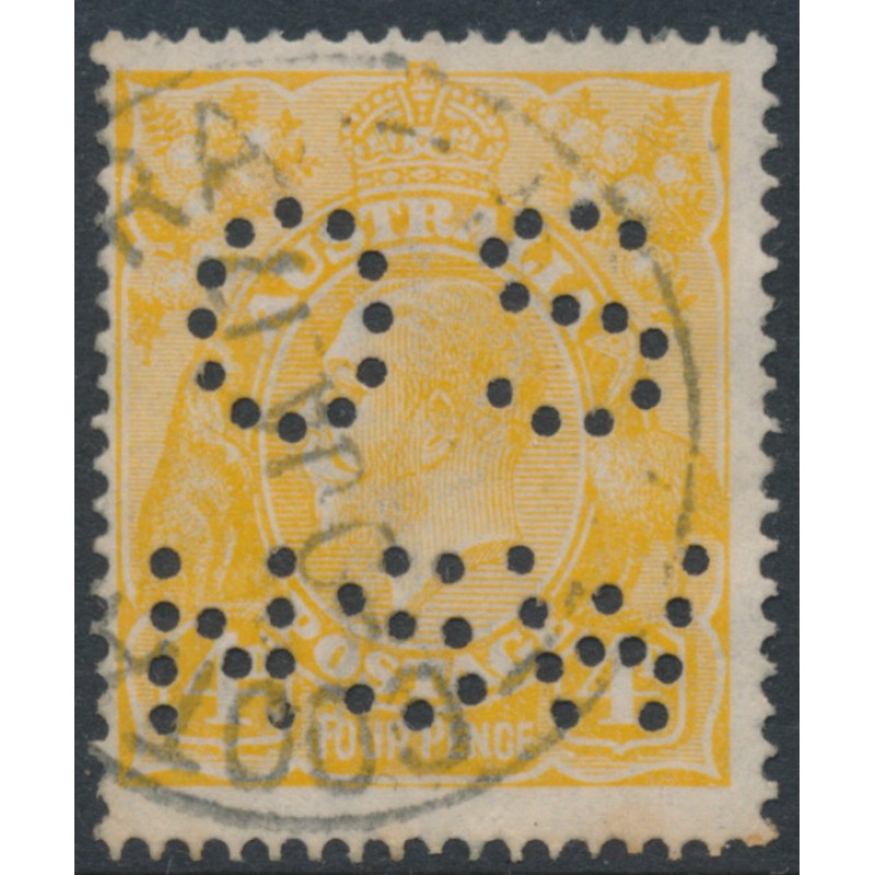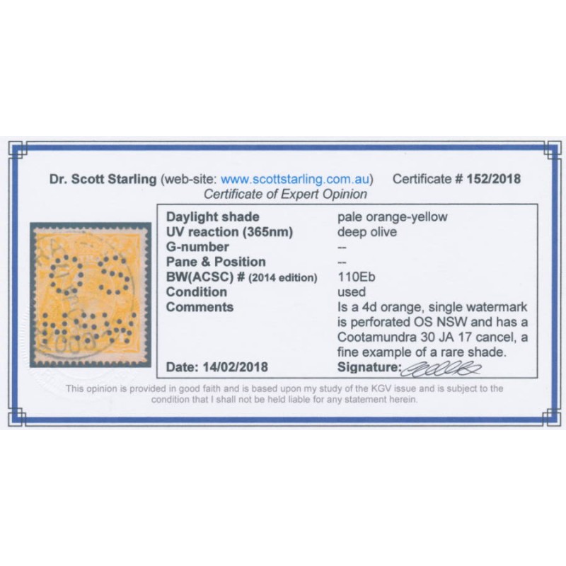 AUSTRALIA 1917 4d pale orange-yellow KGV Head, single watermark, perf. OS NSW, used – no thins, tears or bends. Has a Starling certificate. BW(ACSC) Cat. # 110Eb