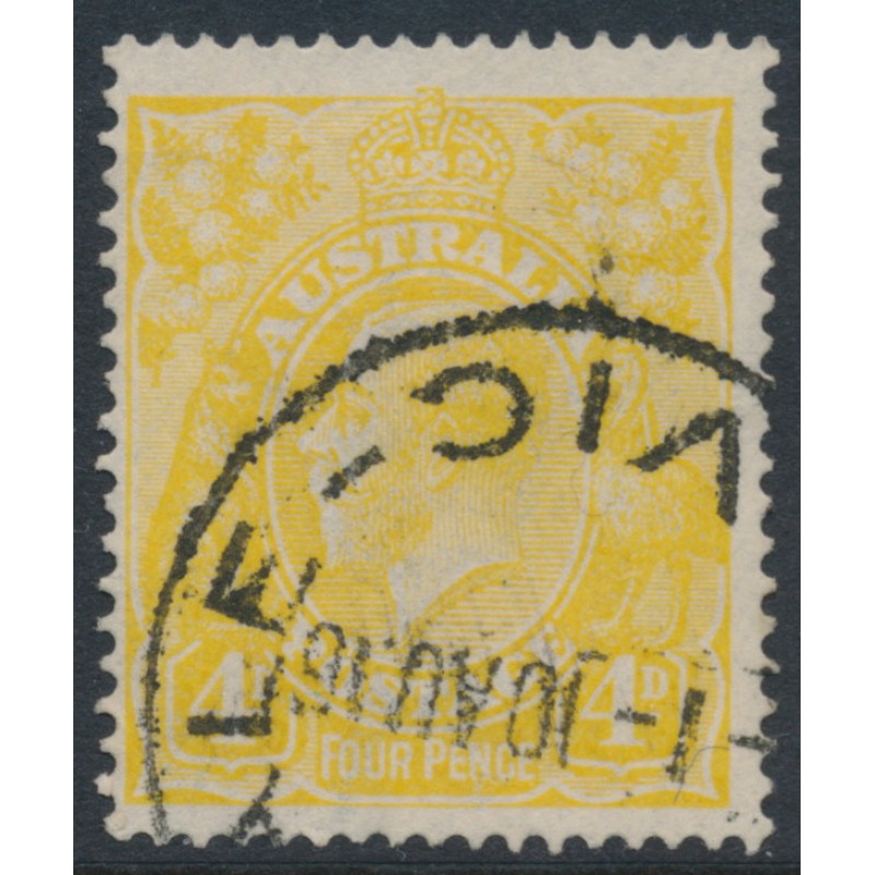 AUSTRALIA 1916 4d lemon-yellow KGV Head, single watermark, used – no thins, tears or bends. Has a Starling certificate. BW(ACSC) Cat. # 110C