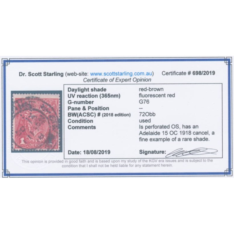 1918 1d red-brown KGV Head (shade = G76), perforated OS, used – no thins, tears or bends. Has a Starling certificate.