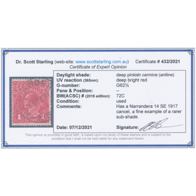 1917 1d deep pinkish carmine [aniline] KGV Head (shade = G62½), used – has a Narrandera 14 SE 1917 cancel, no thins, tears or bends. Has a Starling certificate.