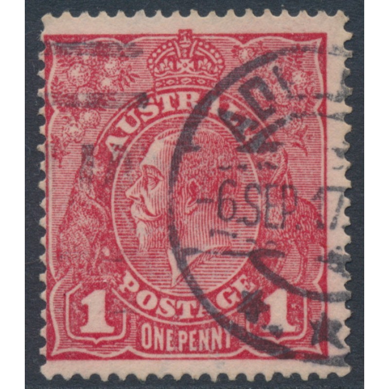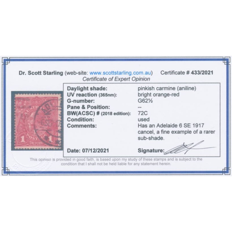 AUSTRALIA 1917 1d pinkish carmine [aniline] KGV Head (shade = G62½), used – no thins, tears or bends. Has a Starling certificate. BW(ACSC) Cat. # 72C