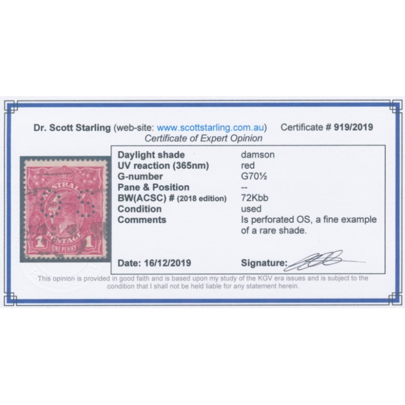 AUSTRALIA - 1918 1d damson KGV (shade = G70½), perf. OS, used – ACSC # 72Kbb