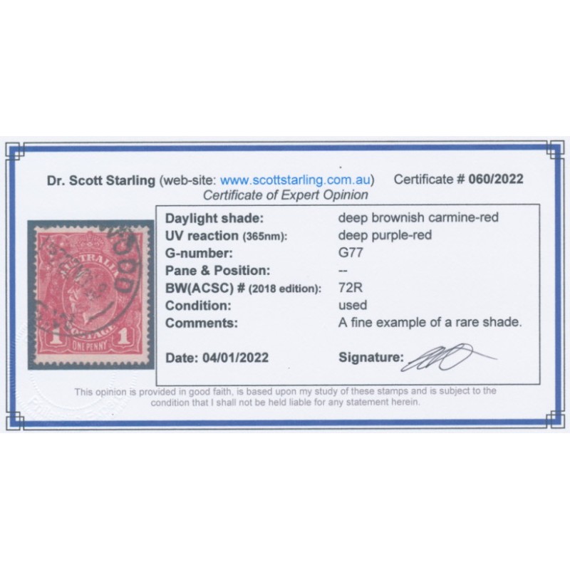 AUSTRALIA 1918 1d deep brownish carmine-red (maroon) KGV Head (shade = G77), used – no thins, tears or bends. Has a Starling certificate. BW(ACSC) Cat. # 72R
