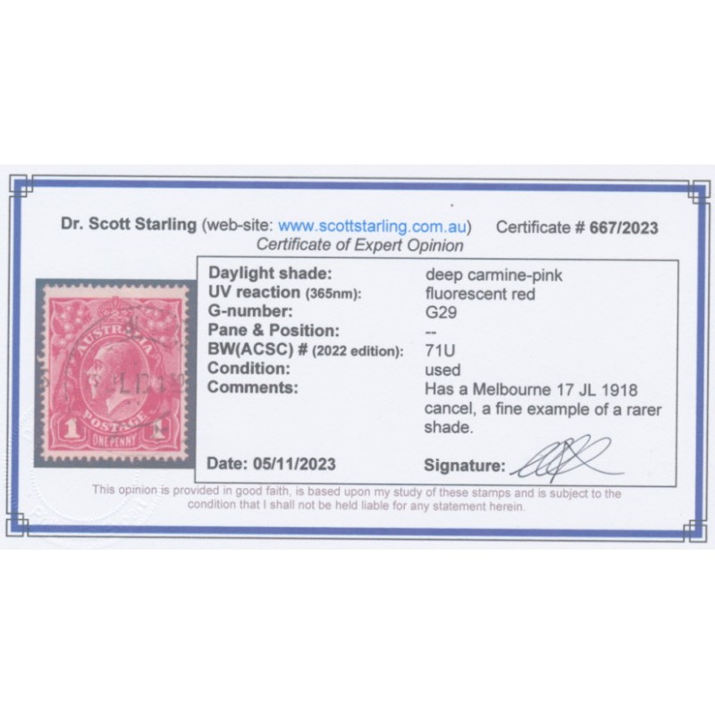 AUSTRALIA 1918 1d deep carmine-pink KGV Head (shade = G29), used – no thins, tears or bends. Has a Starling certificate. BW(ACSC) Cat. # 71U