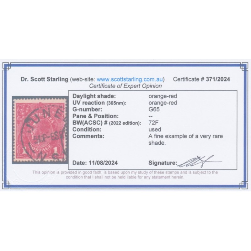 AUSTRALIA 1917 1d orange-red KGV Head (shade = G65), used – no thins, tears or bends. Has a Starling certificate. BW(ACSC) Cat. # 72Fa