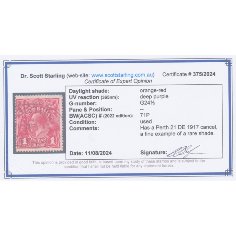 1917 1d orange-red KGV Head (shade = G24½), used – no thins, tears or bends. Has a Starling certificate.