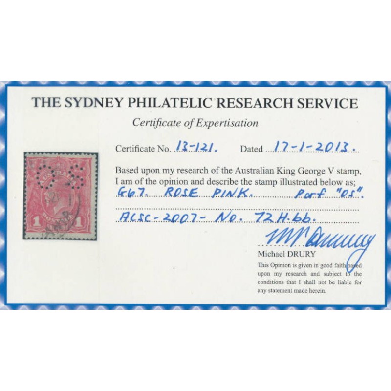 AUSTRALIA 1918 1d rose-pink KGV Head (shade = G67) perforated OS, used – no thins, tears or bends. Has a Drury certificate. BW(ACSC) Cat. # 72Hbb