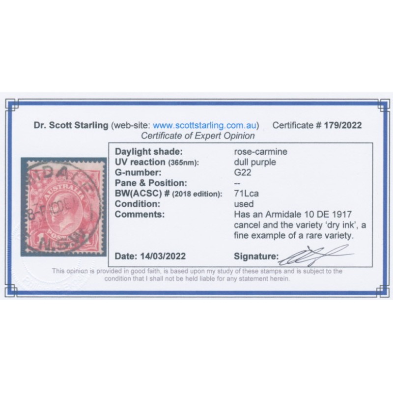 AUSTRALIA 1917 1d rose-carmine KGV Head (shade = G22), with the variety ‘dry ink’, used – no thins, tears or bends. Has a Starling certificate. BW(ACSC) Cat. # 71Lca