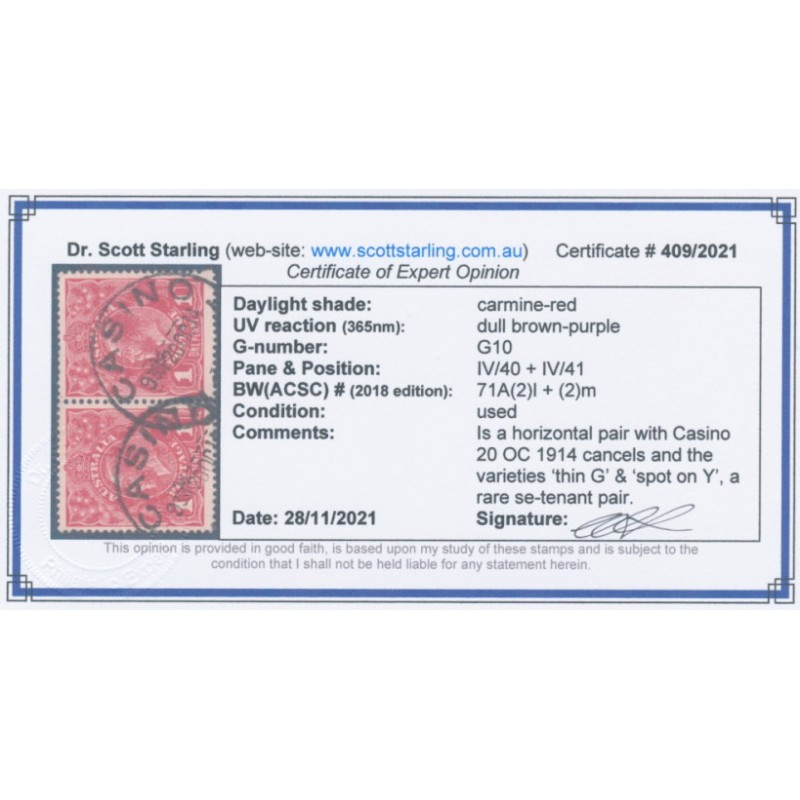 ![AUSTRALIA - 1914 1d red KGV (G10), ‘thin G’+‘spot on Y’ [IV/40+41], used – ACSC # 71D(2)l+(2)m AUSTRALIA - 1914 1d red KGV (G10), ‘thin G’+‘spot on Y’ [IV/40+41], used – ACSC # 71D(2)l+(2)m](https://www.scottstarling.com.au/image/cache/catalog/PennyVarieties/18087-250x250.jpg)