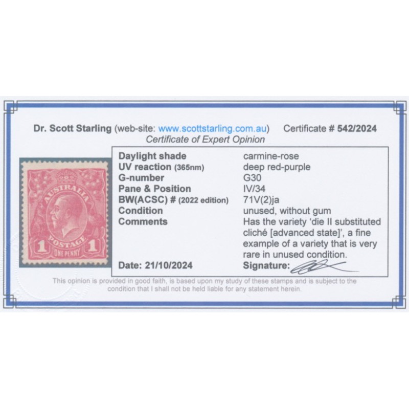 ![AUSTRALIA - 1918 1d red KGV (G30), die II substituted cliché [IV/34], MNG – ACSC # 71V(2)ja AUSTRALIA - 1918 1d red KGV (G30), die II substituted cliché [IV/34], MNG – ACSC # 71V(2)ja](https://www.scottstarling.com.au/image/cache/catalog/PennyVarieties/23200b-74x74.jpg)