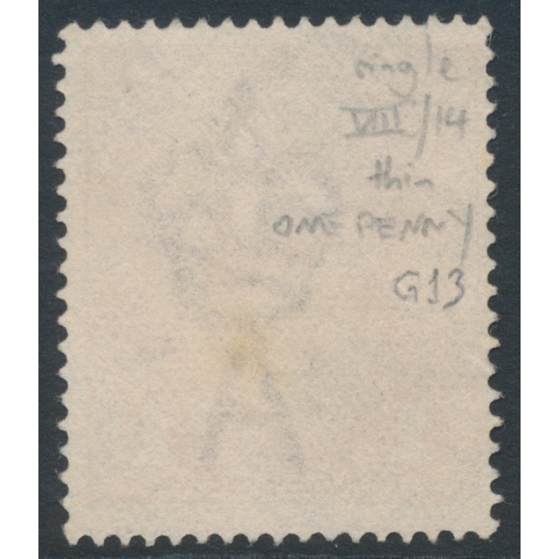 1914 1d deep red KGV Head (shade = G13), has the variety ‘thin ONE PENNY’ [position = VIII/14], used – no thins, tears or bends.