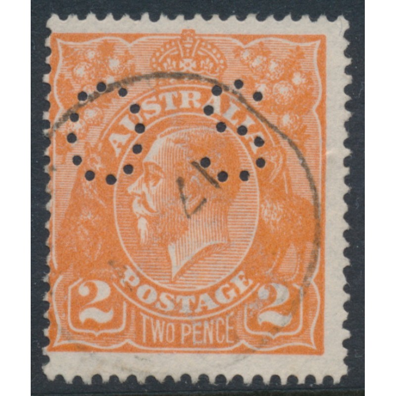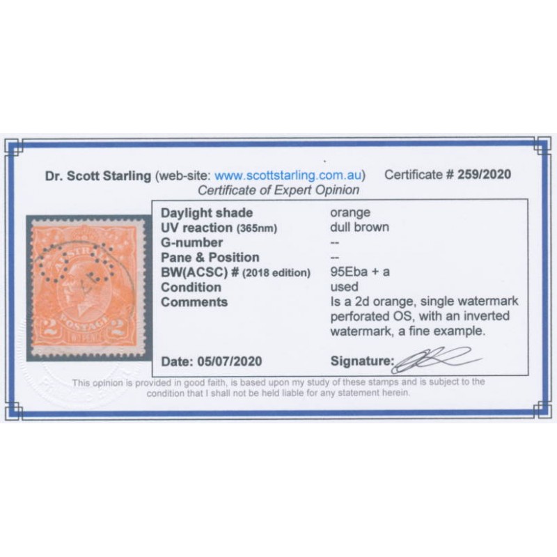 AUSTRALIA 1920 2d orange KGV Head, single watermark, perforated OS, with an inverted watermark, used – no thins, tears or bends. Has a Starling certificate. BW(ACSC) Cat. # 95Eba + a