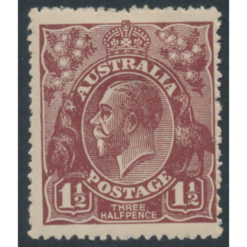 AUSTRALIA 1919 1½d chocolate KGV Head, single watermark with watermark inverted, mint hinged – no thins, tears or bends. Has a Starling certificate. BW(ACSC) Cat. # 85Ca SG Cat. # 59w
