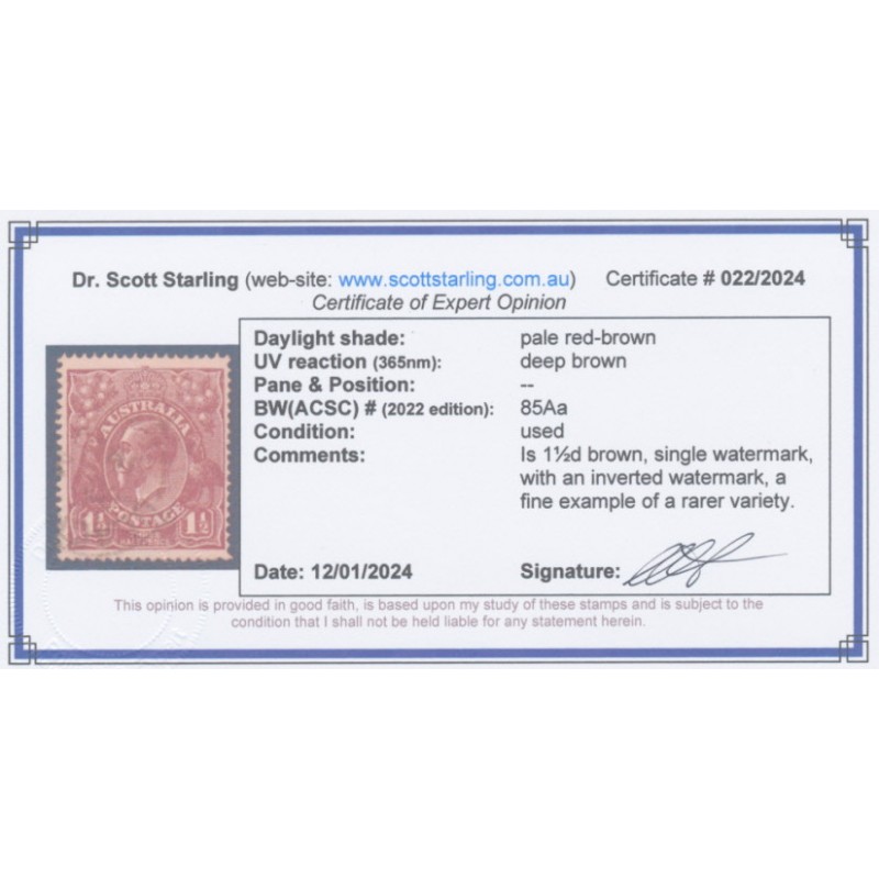 AUSTRALIA 1919 1½d pale red-brown KGV Head, single watermark, watermark inverted, used – no thins, tears or bends. Has a Starling certificate. BW(ACSC) Cat. # 85Aa SG Cat. # 59w