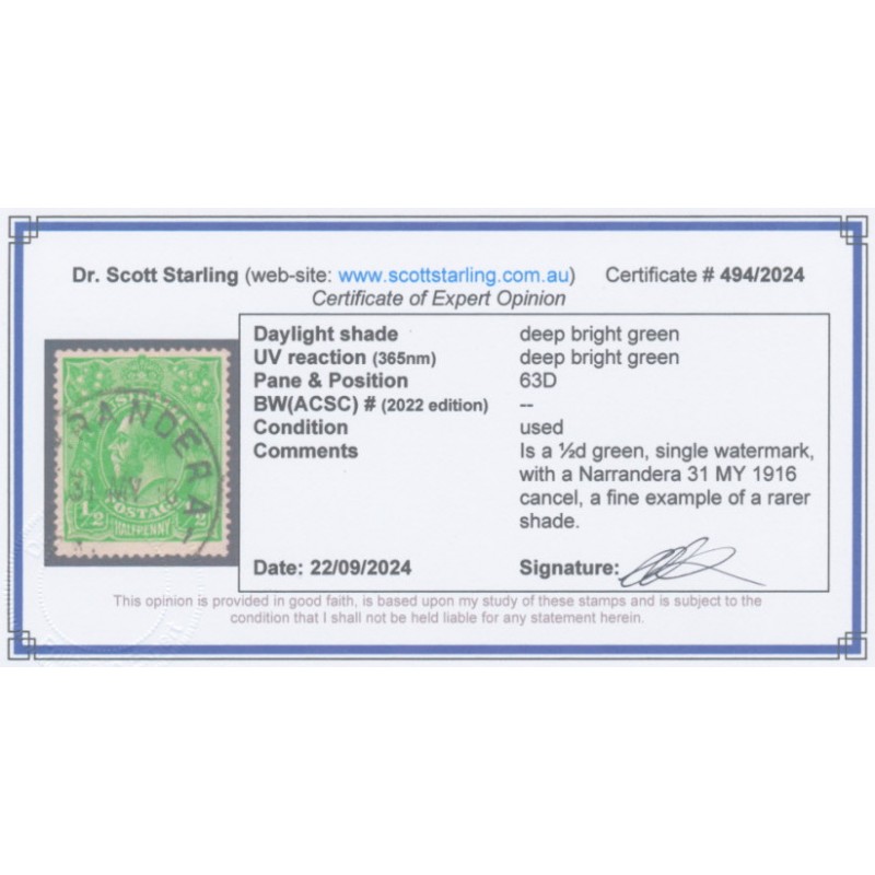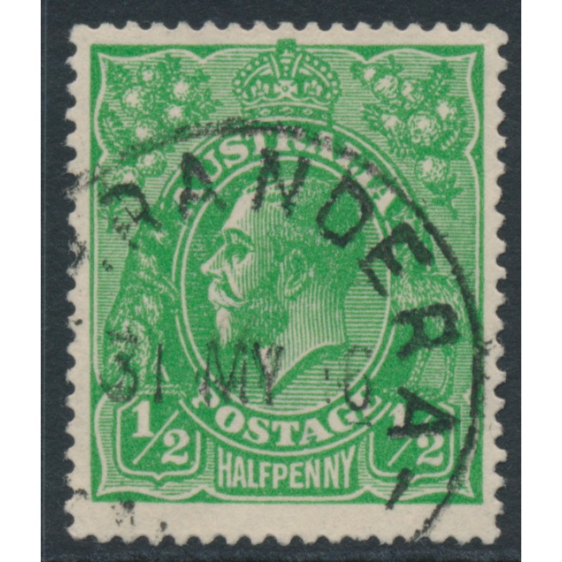 AUSTRALIA 1915 ½d deep bright green KGV Head, single watermark, used – no thins, tears or bends. Has a Starling certificate. BW(ACSC) Cat. # 63D
