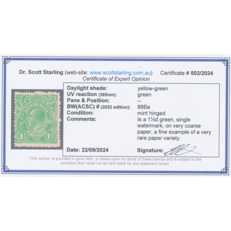 1923 1½d yellow-green KGV Head, single watermark, on very coarse mesh paper, mint hinged – no thins, tears or bends. Has a Starling certificate.