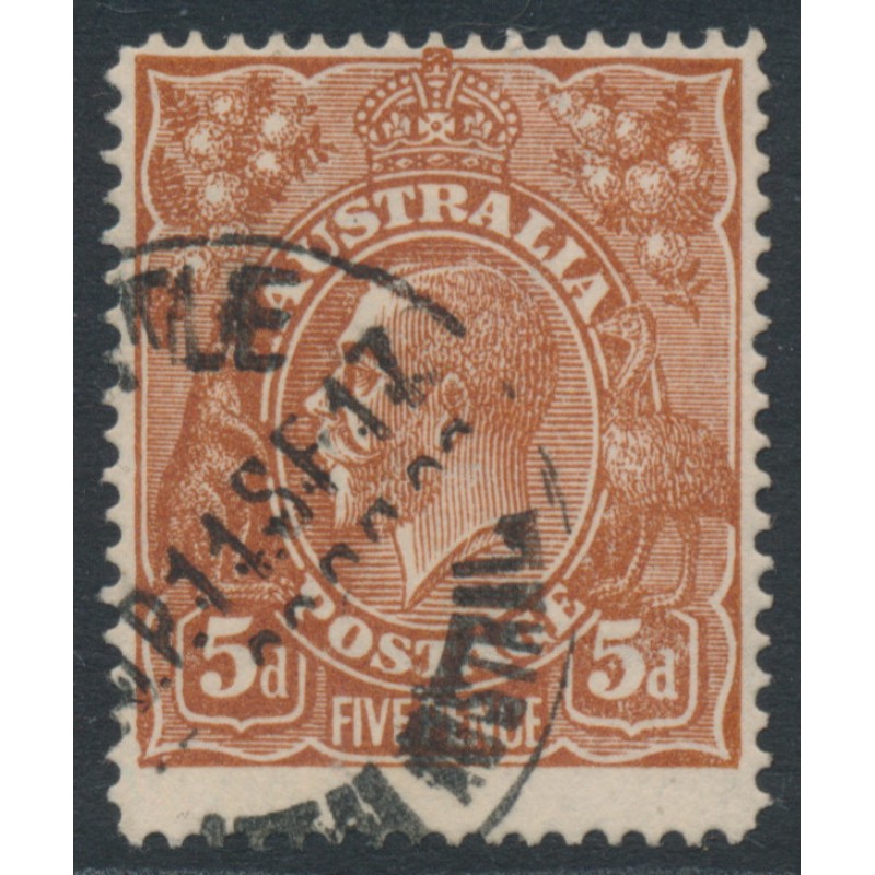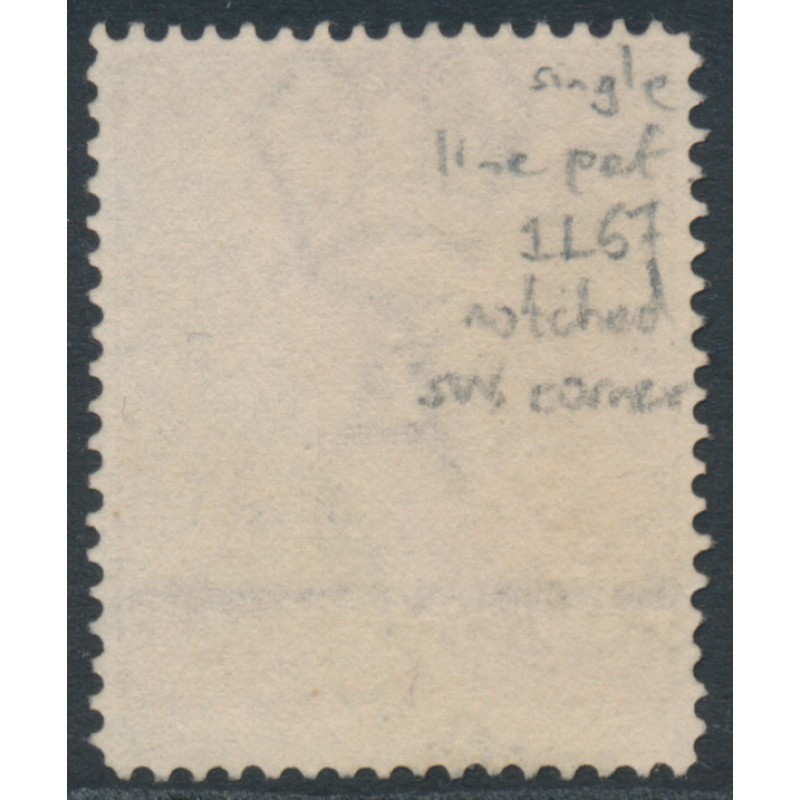 1915 5d deep chestnut KGV Head, single watermark, line perforated, with the variety ‘notch in SW corner’ [position = 1L57], used – no thins, tears or bends. Has a Starling certificate.