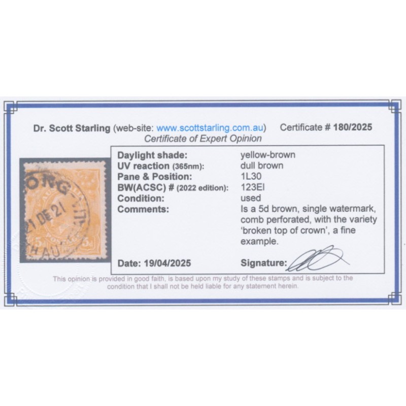 ![AUSTRALIA - 1917 5d brown KGV, 'broken crown top' [1L30], used – ACSC # 123El AUSTRALIA - 1917 5d brown KGV, 'broken crown top' [1L30], used – ACSC # 123El](https://www.scottstarling.com.au/image/cache/catalog/KGVGeneral/25271b-74x74.jpg)