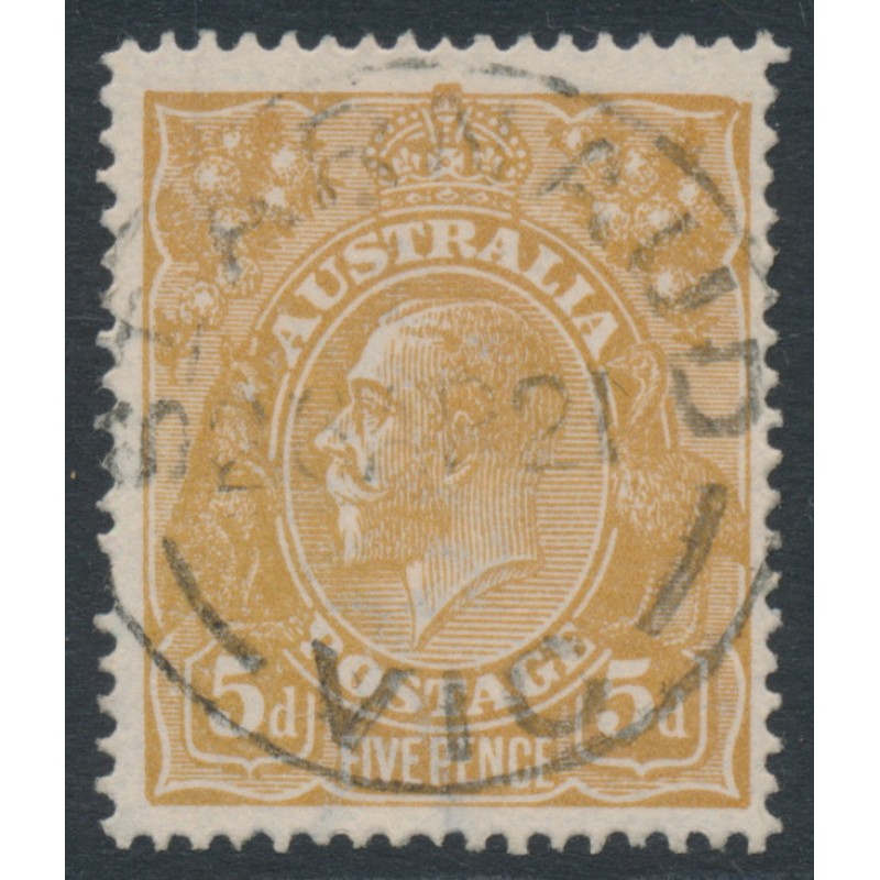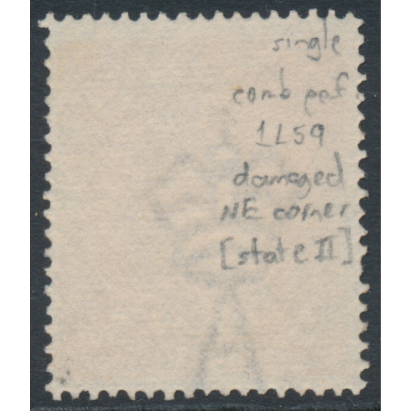 1917 5d pale yellow-brown KGV Head, single watermark, comb perforated, with the variety ‘damaged NE corner [state II]’ [position = 1L59], used – no thins, tears or bends. Has a Starling certificate.