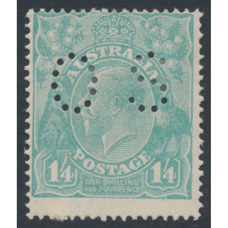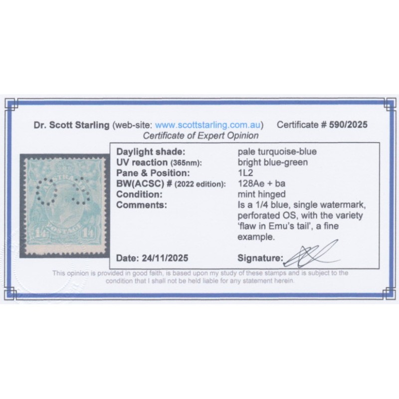 1920 1/4 pale turquoise-blue KGV Head, single watermark, perforated OS, with the variety ‘flaw on Emu’s tail’, [plate position = 1L2], mint hinged – no thins, tears or bends. Has a Starling certificate.