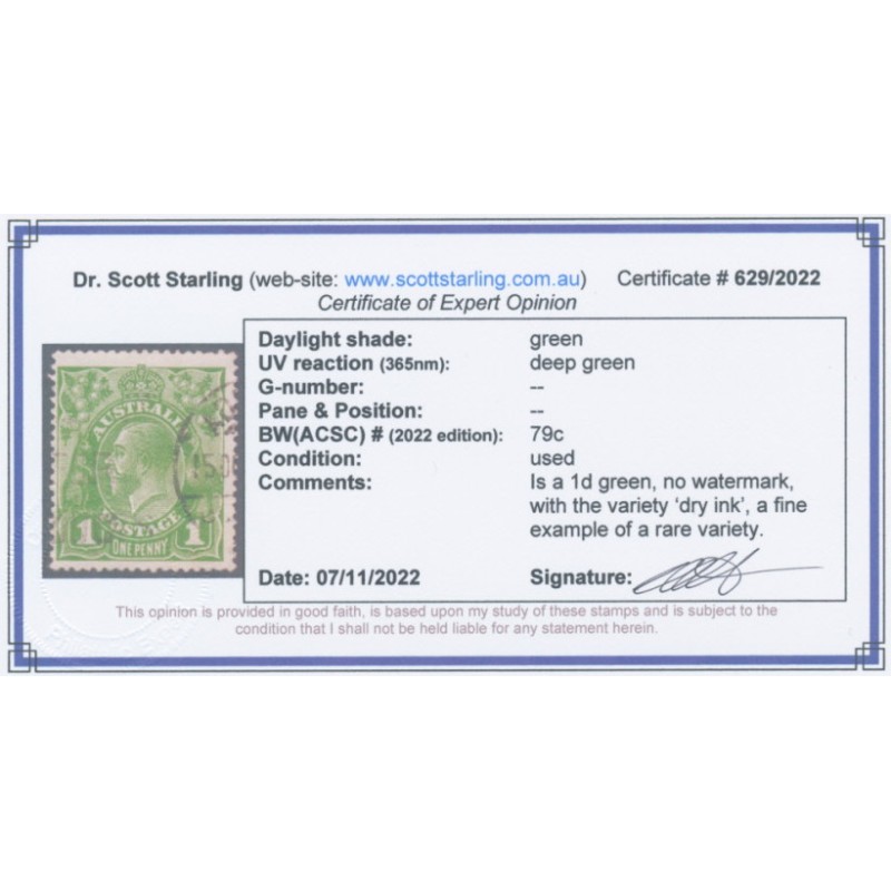 AUSTRALIA 1924 1d green KGV Head, no watermark, with the variety ‘dry ink’, used – no thins, tears or bends. Has a Starling certificate. BW(ACSC) Cat. # 79c