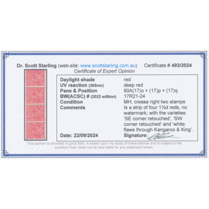 1924 1½d red KGV Head, no watermark, horizontal strip of 4 with the varieties: ‘SE corner retouched’, ‘SW corner retouched’ and ‘white flaws through Kangaroo & King’ [plate positions = 17R21 to 17R24], mint hinged – the right two stamps have a crease, otherwise sound. Has a Starling certificate.